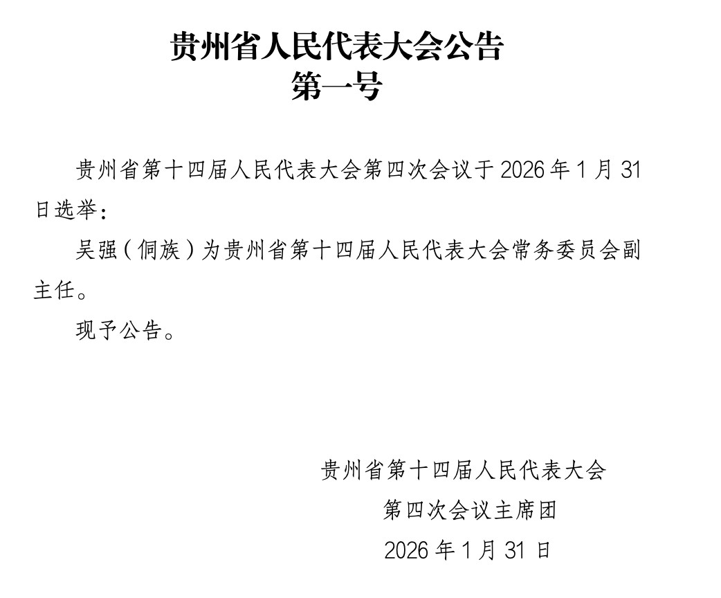 吴强当选为贵州省第十四届人民代表大会常务委员会副主任