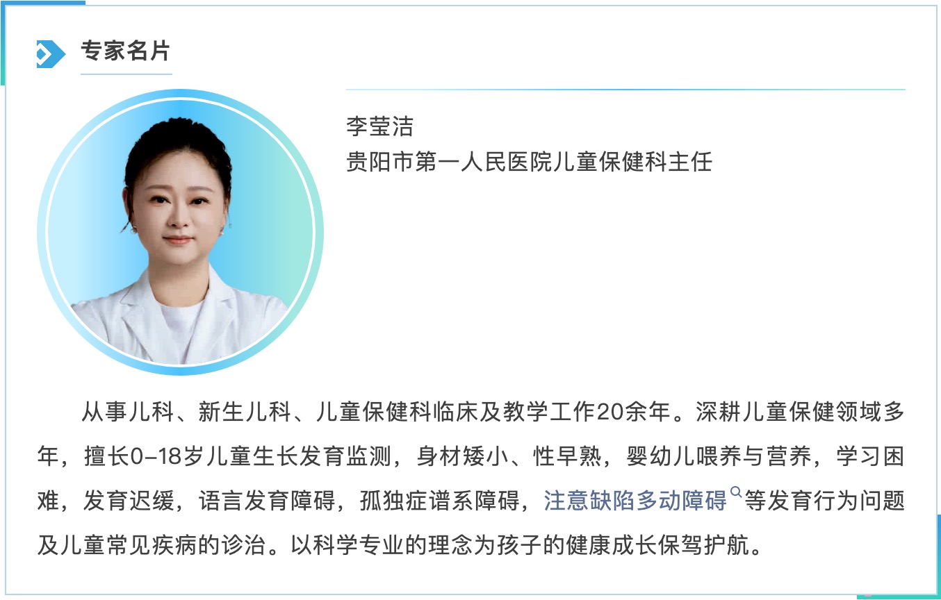 本期我们邀请到贵阳市第一人民医院儿童保健科李莹洁主任,以快问快答的形式,为大家解答儿保高频问题,拆解养娃常见误区,用专业知识帮家长科学育儿!