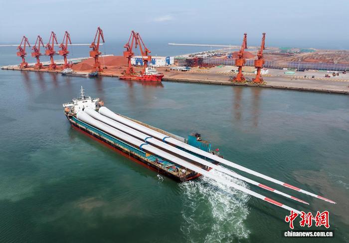 记者8月6日从山东港口烟台港获悉,搭载3支超大尺寸海上风电叶片的“盛达联航”轮近日在该港装船发运,刷新全球已下线最长风电叶片吊装纪录。这批风电叶片自重83.5吨,长153米,是目前全球已下线的最长风电叶片,其专为26兆瓦级海上风电机组量身打造。