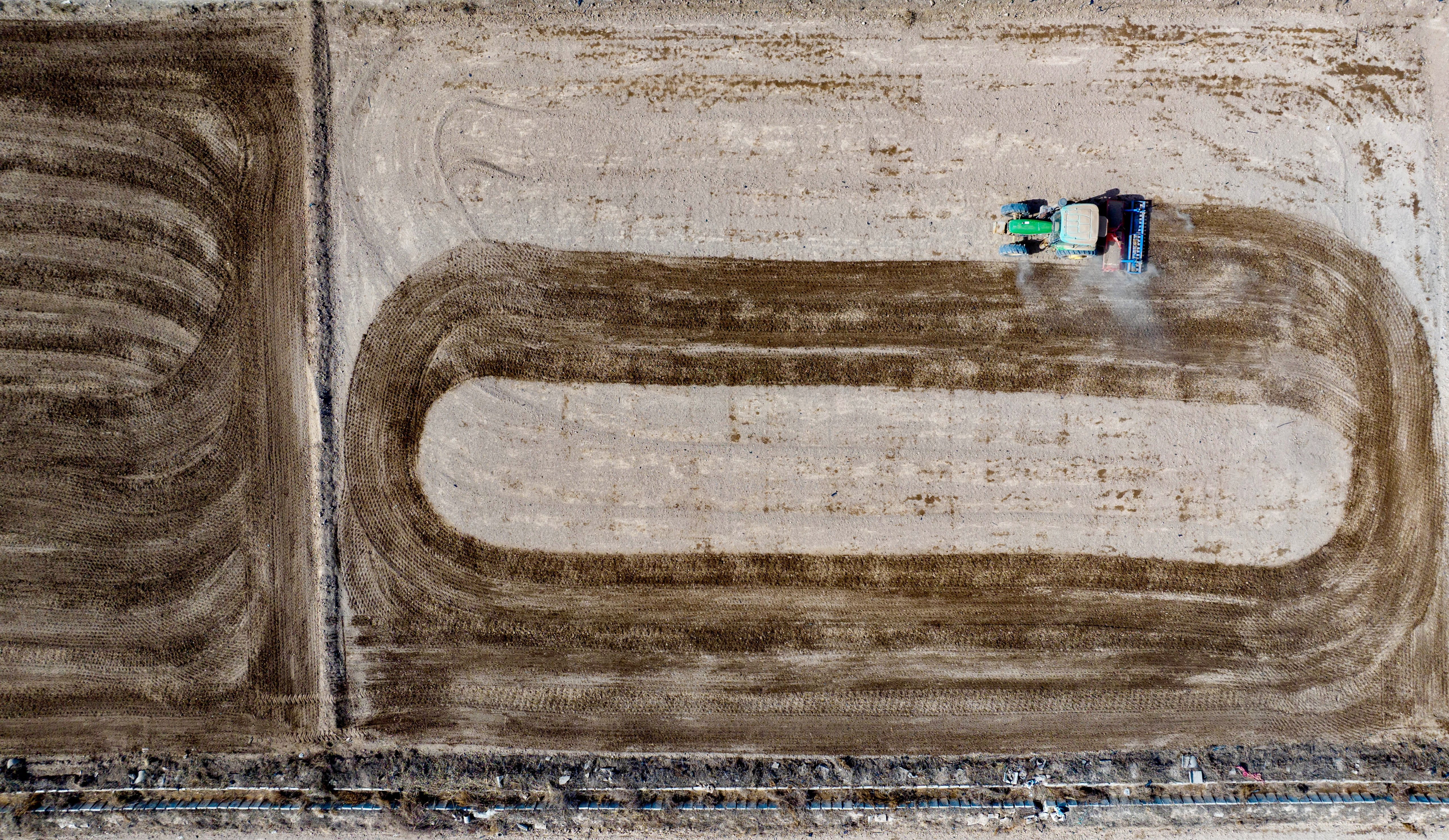 2月24日,在宁夏银川市贺兰县金贵镇银河村,农民驾驶旋耕机平整土地(无人机照片)。近日,宁夏银川市贺兰县的农民积极开展小麦春耕备耕,田间地头一片繁忙的景象。新华社记者 杨植森 摄