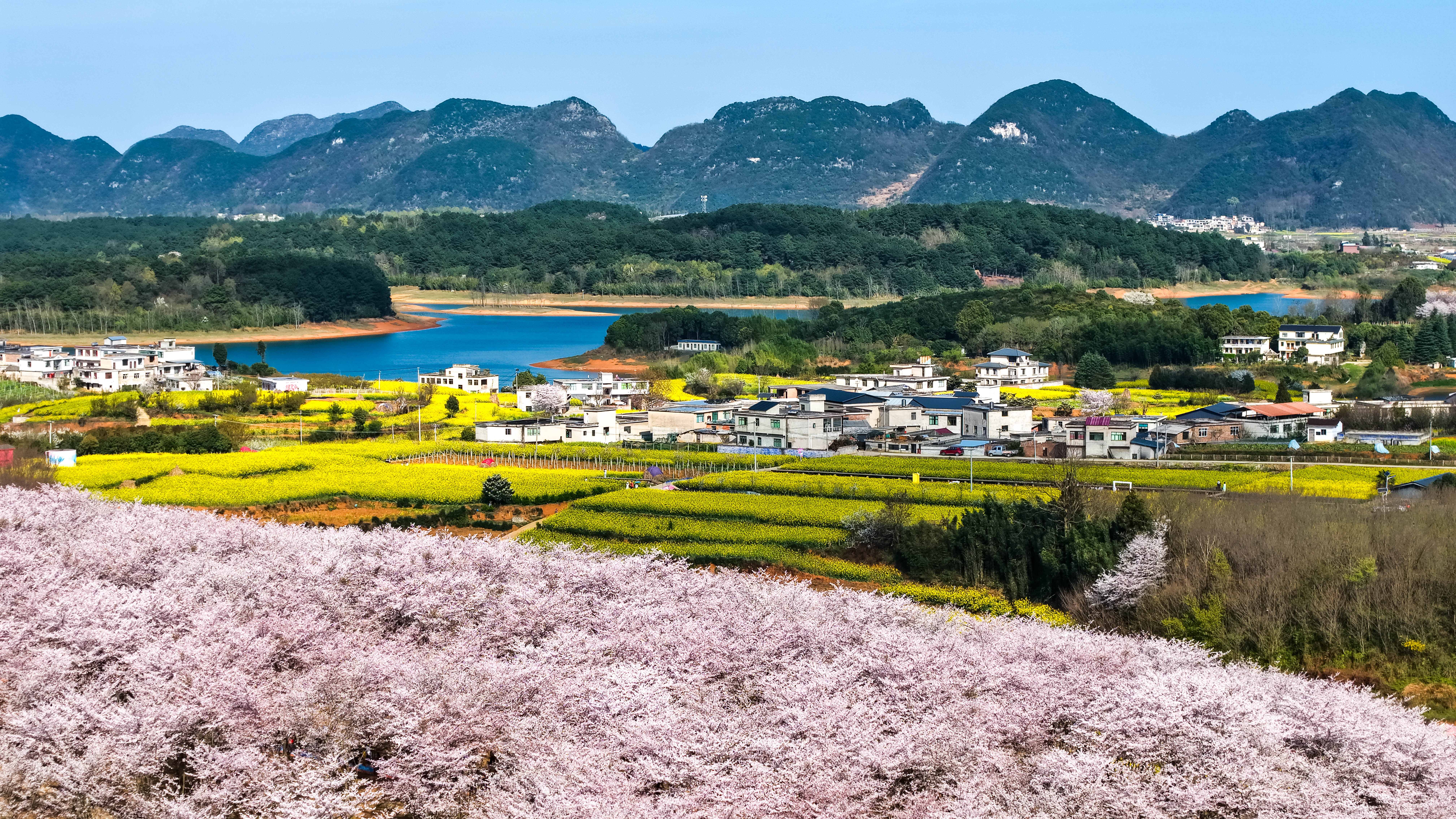三月黔中,贵安樱花园的万亩樱花如约绽放。这片占地2.4万亩、坐拥70万株樱花的花海,被誉为“蓝色星球上最美的樱花园”之一。马来西亚游客梁英强慕名而来,他说:“在马来西亚,我们都知道贵州有全球最美的樱花园。”