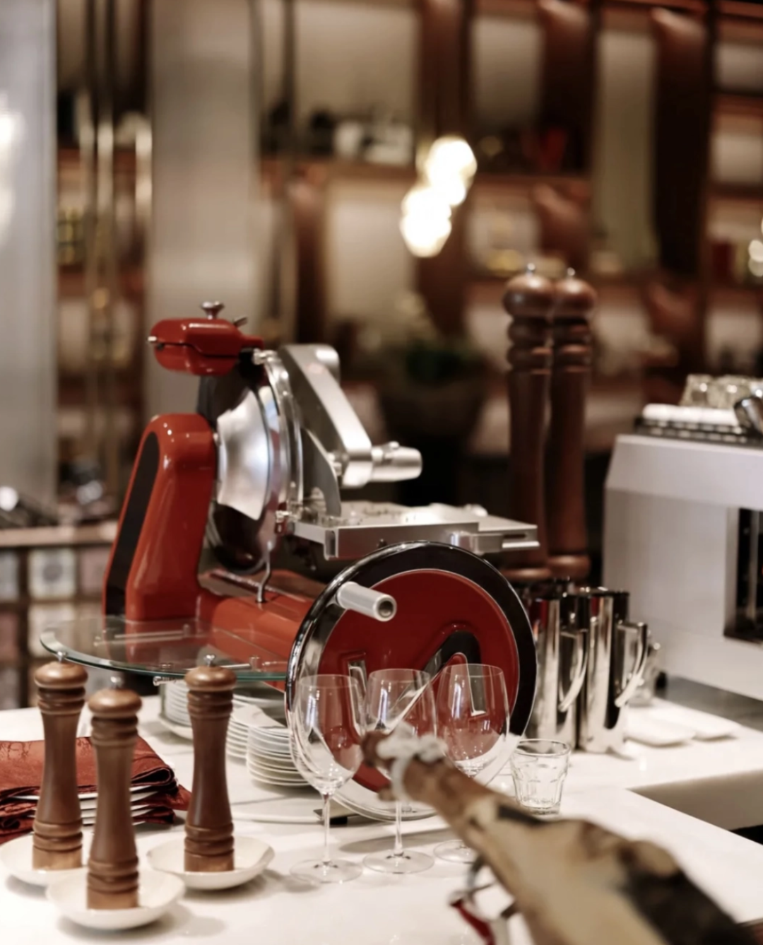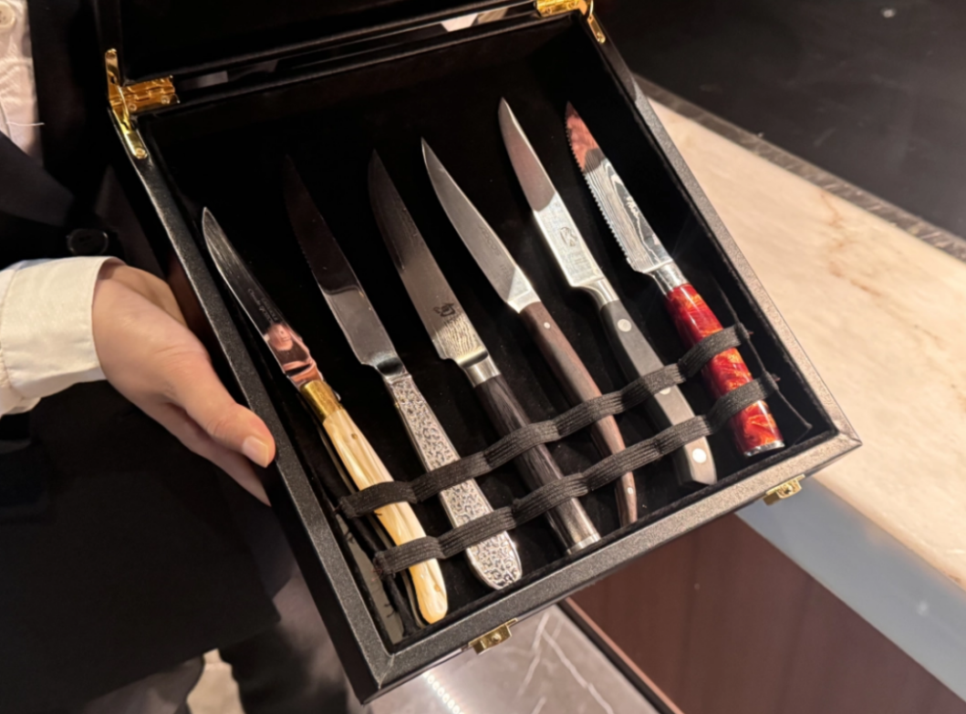 “晚上好,先生。今晚的牛排之旅,可以从选择一把属于您的餐刀开始。”身着合体西装的服务生稳步上前,手中托着一方敞开的黑色木匣。匣内整齐排列着六把来自法国、西班牙、瑞士等地的餐刀,刀柄纹路各异,在灯光下泛着低调的金属光泽。“这一把来自法国,刀身轻盈,适合喜欢细腻切割感的您;这把西班牙刀,重量适中,握感扎实……”