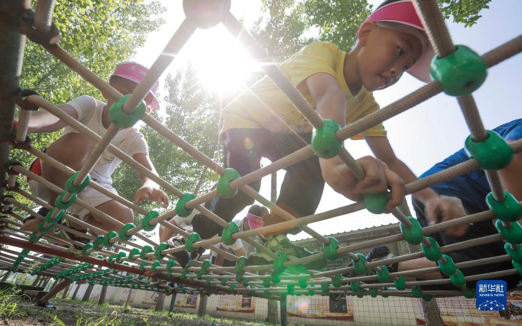 7月8日,参加少年夏令营的孩子在河北省遵化市小厂乡的训练营地进行穿越障碍训练。新华社发(刘满仓摄)