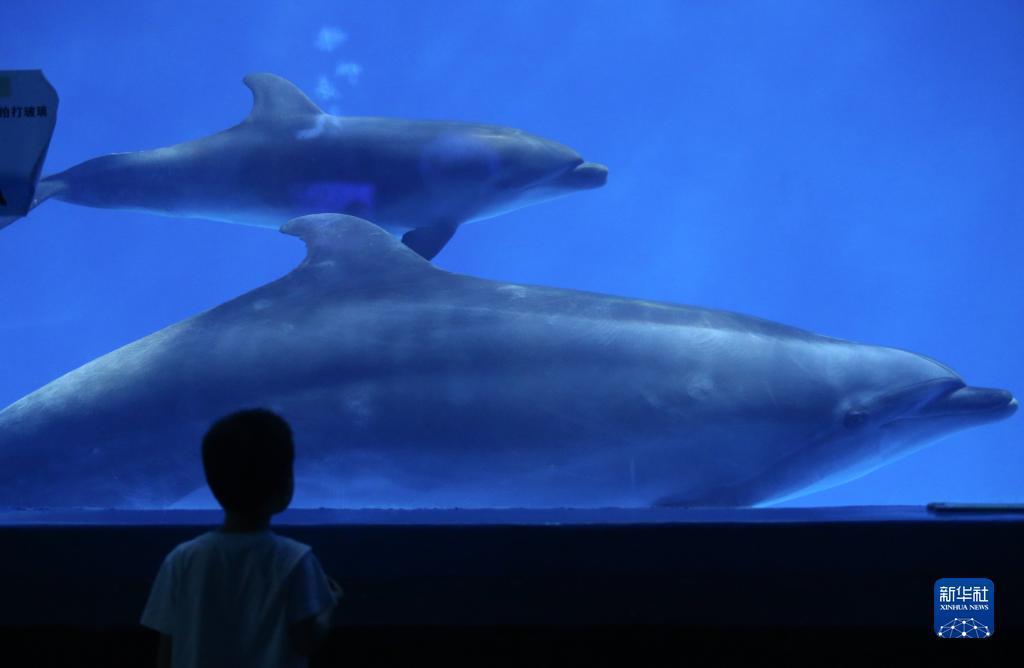 7月8日,一名小朋友在多彩贵州城极地海洋世界观赏宽吻海豚。新华社发(张晖摄)