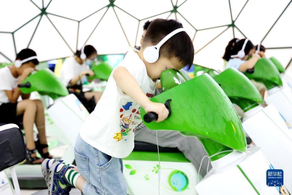 7月8日,儿童在中国杭州低碳科技馆参观体验。新华社发(周方玲摄)