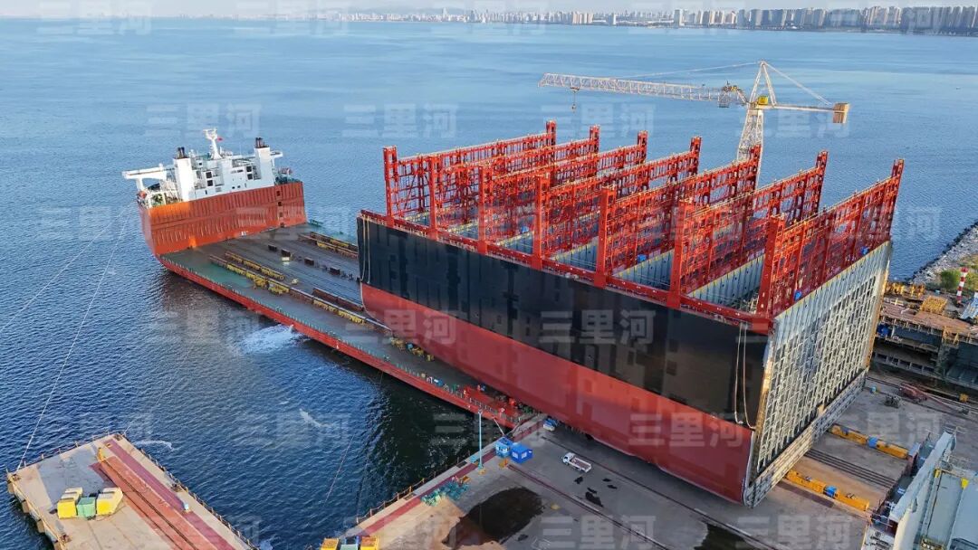 山东烟台,在黄渤海新区一家造船企业,一座将被送往总装基地的船体分段正在装上半潜船。
