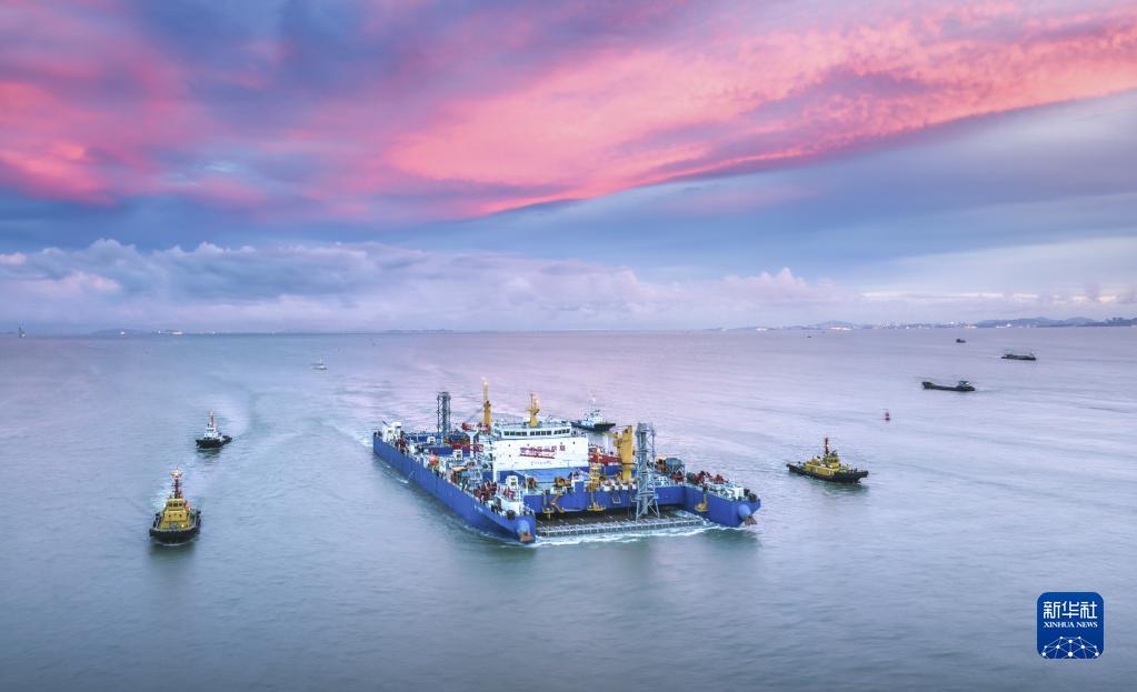 “一航津安1”号沉管运输安装一体船将E23管节和最终接头浮运至安装现场(无人机照片,2023年6月8日摄)。新华社发