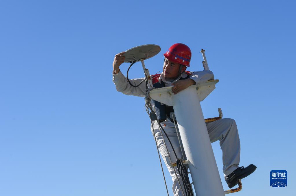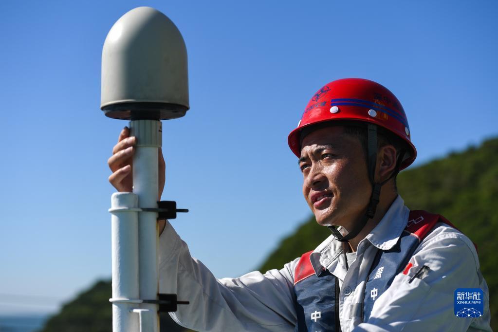 锁旭宏检查“一航津安1”号沉管运输安装一体船上的北斗卫星数据接收设备(2022年7月22日摄)。新华社记者 刘大伟 摄