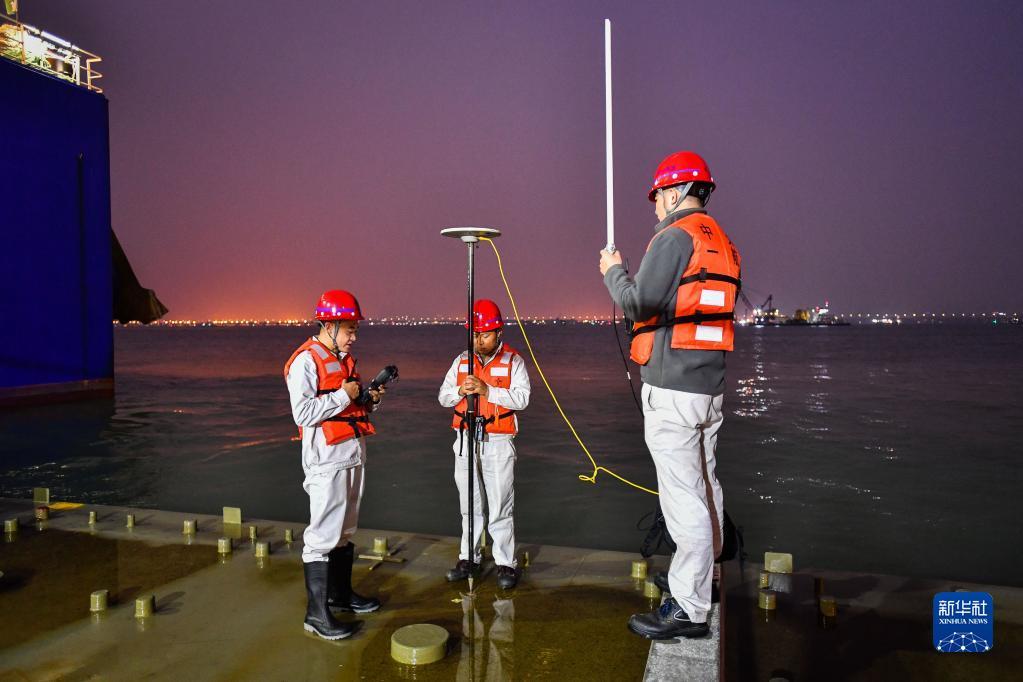锁旭宏(左)带领团队在“一航津安1”号沉管运输安装一体船搭载的E16沉管上检查北斗卫星定位精准测量(2022年1月14日摄)。新华社记者 刘大伟 摄