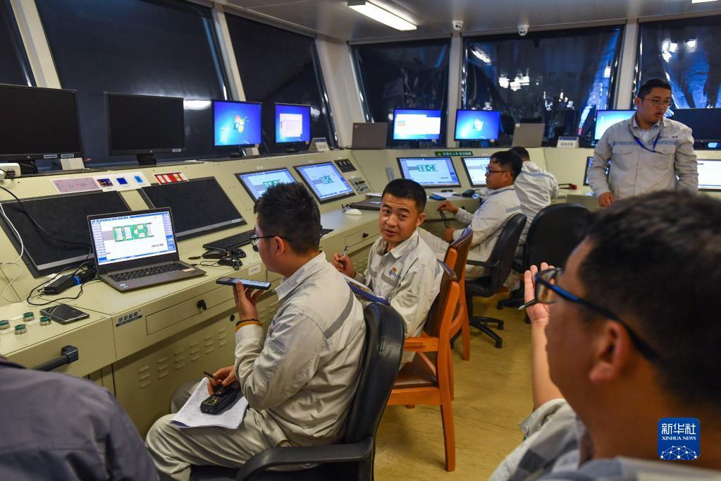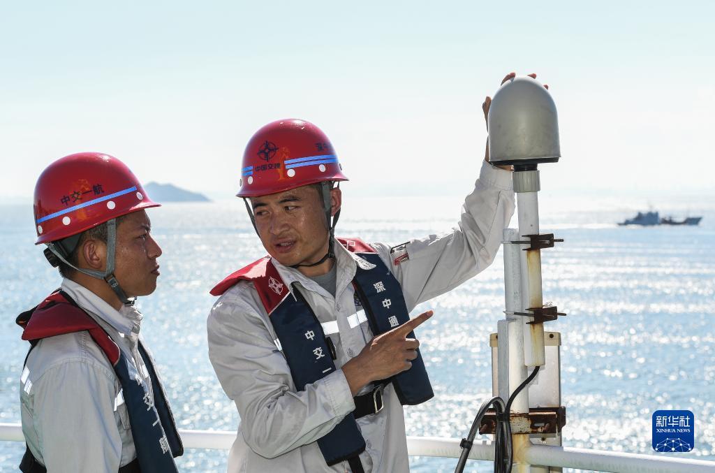 锁旭宏(右)指导队友检查“一航津安1”号沉管运输安装一体船上的北斗卫星数据接收设备(2022年7月22日摄)。新华社记者 刘大伟 摄