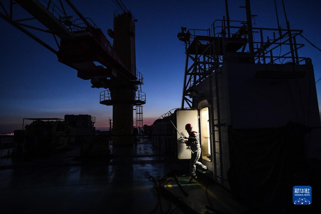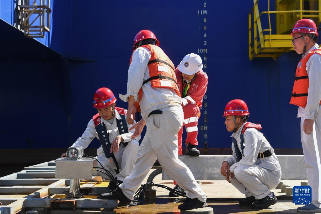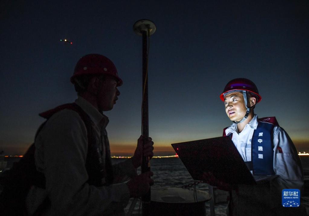 锁旭宏(右)和队友在“一航津安1”号沉管运输安装一体船搭载的E19沉管上检查北斗卫星定位精准测量(2022年7月22日摄)。新华社记者 刘大伟 摄
