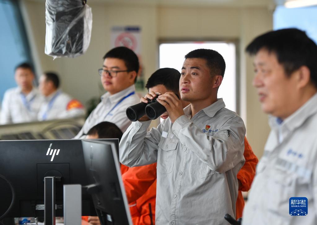 锁旭宏(右二)在“一航津安1”号沉管运输安装一体船驾驶台观察航线(2022年1月14日摄)。新华社记者 刘大伟 摄