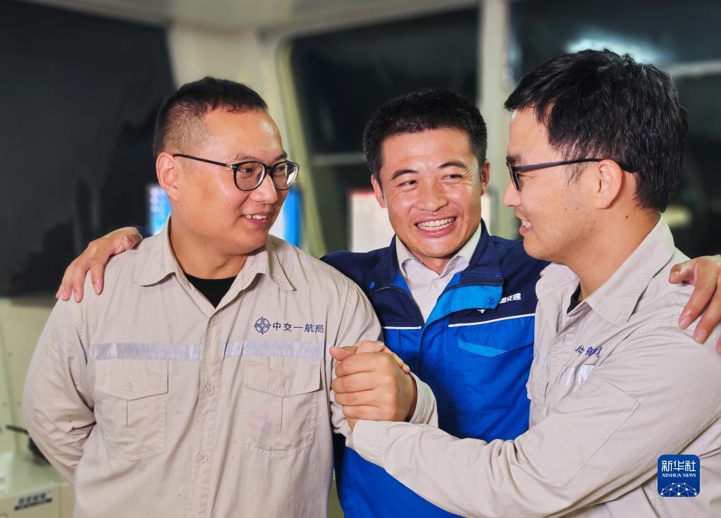 在深中通道海底隧道管节最终接头合龙后,锁旭宏(中)和团队成员庆贺(2023年6月11日)。新华社记者 刘大伟 摄