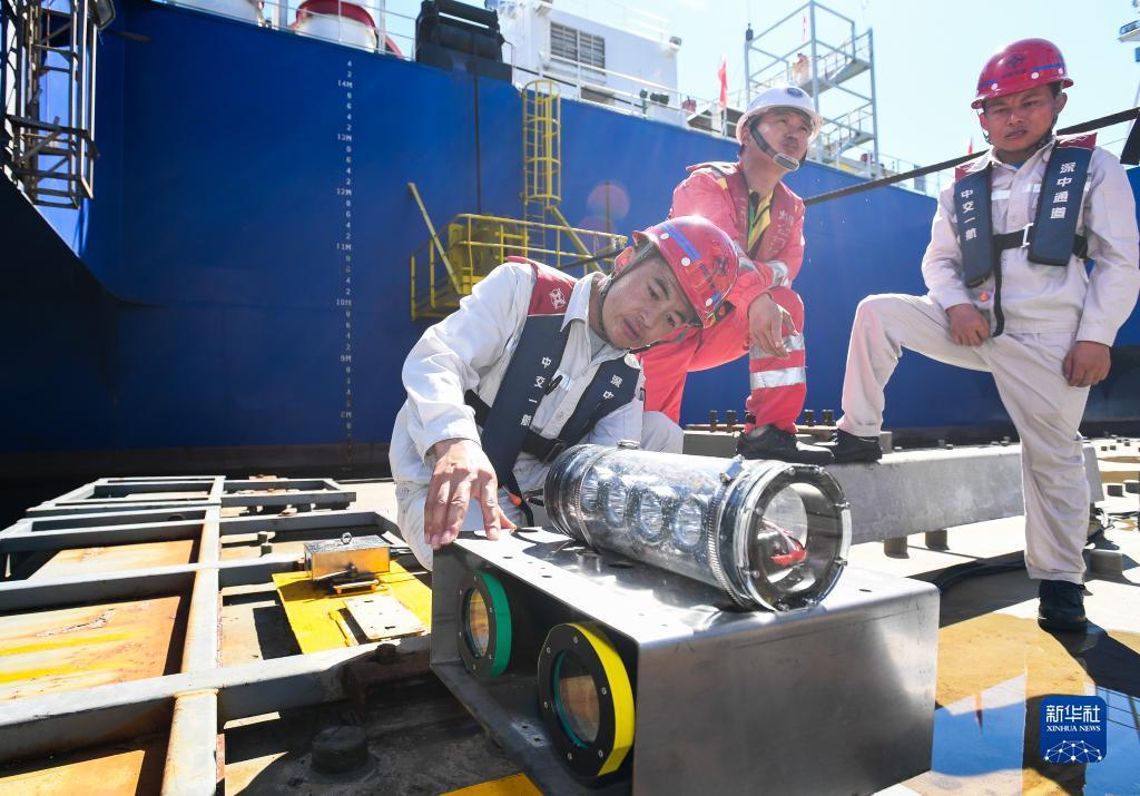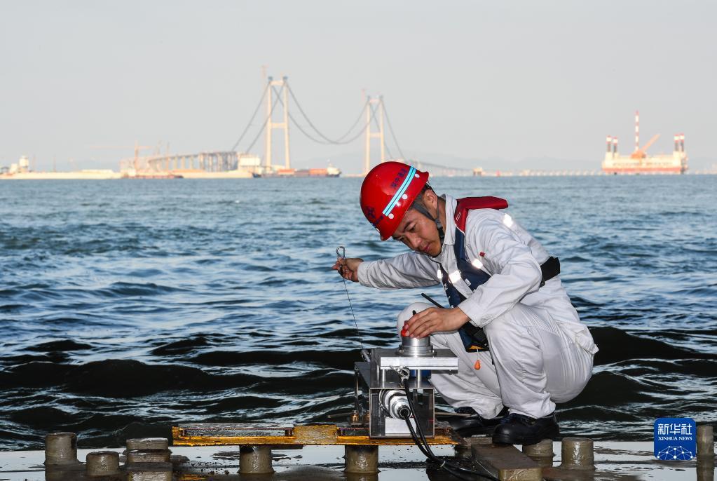 锁旭宏在“一航津安1”号沉管运输安装一体船上检查搭载的E16沉管上的测量装备(2022年1月14日摄)。新华社记者 刘大伟 摄