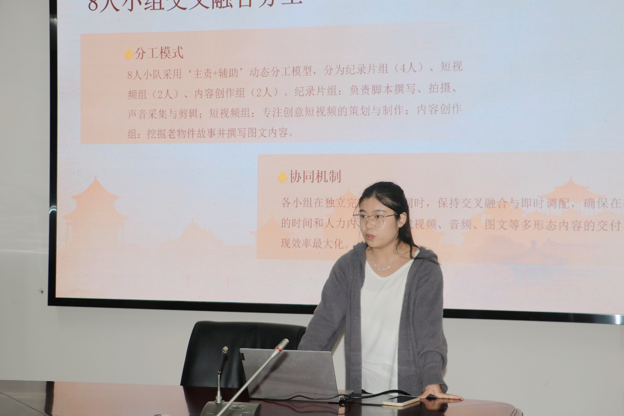 第一团队系统策划多维叙事,创新表达红色文化,向大家展示了其融媒体创作计划。该计划分为四个板块:一部5分钟竖屏纪录片《红流黔迹》、十六条融入老物件互动元素的创意短视频、一批革新性的高质量图文报道,以及一部注重声音叙事的情感纪录片。团队采用“每人一思”策略分工。创作中将运用AI还原等新技术,并尝试以年轻人出演、设置“中国红”主题句等方式,力求缩短历史与当代青年的心理距离,实现红色文化的创新表达与情感共鸣。