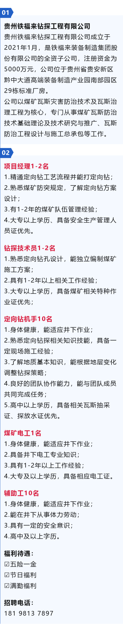 招聘项目经理、钻探技术员、定向钻机手、煤矿电工、辅助工!五险一金、高中起报!
