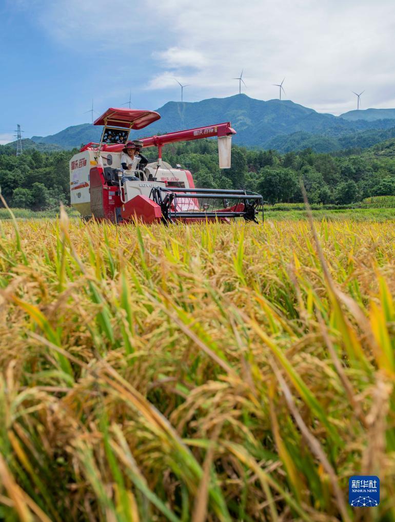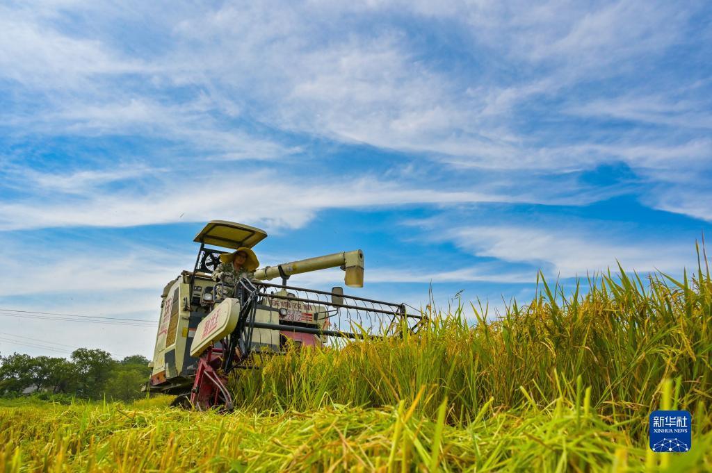 7月10日,在湖南省永州市道县四马桥镇金狮庵村,农民驾驶农机在田间收割早稻。新华社发(蒋克青 摄)