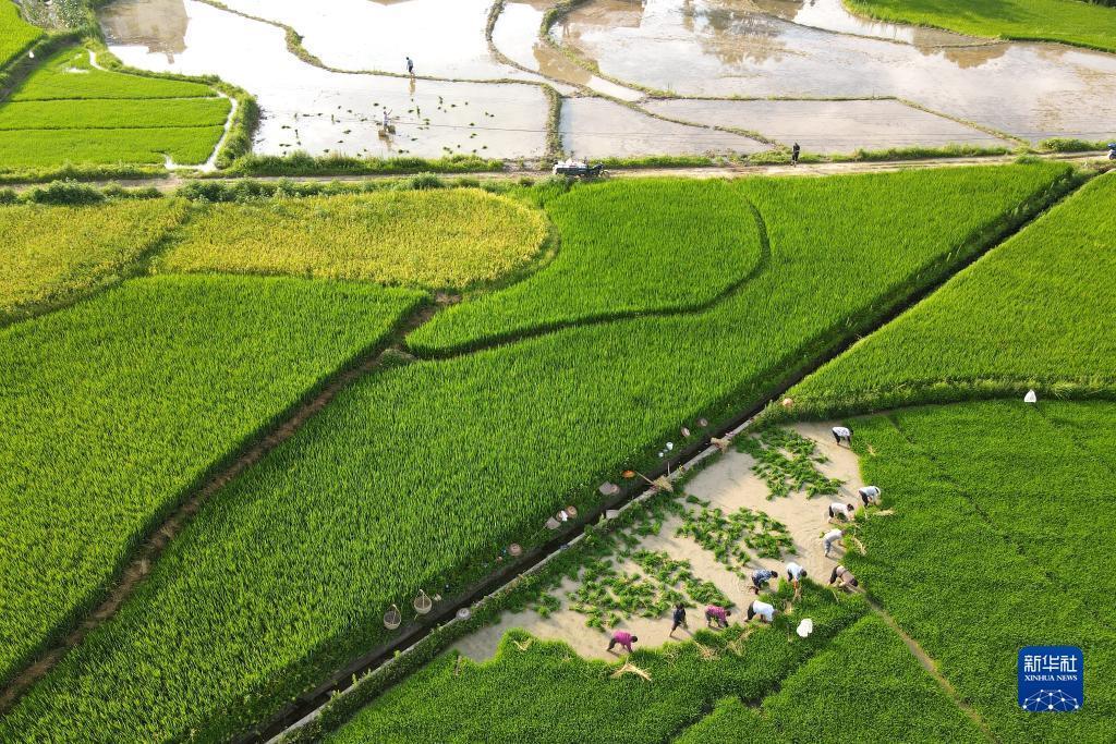 7月11日,在湖南省娄底市双峰县井字镇花山村,农民在田间起秧(无人机照片)。新华社发(李建新 摄)