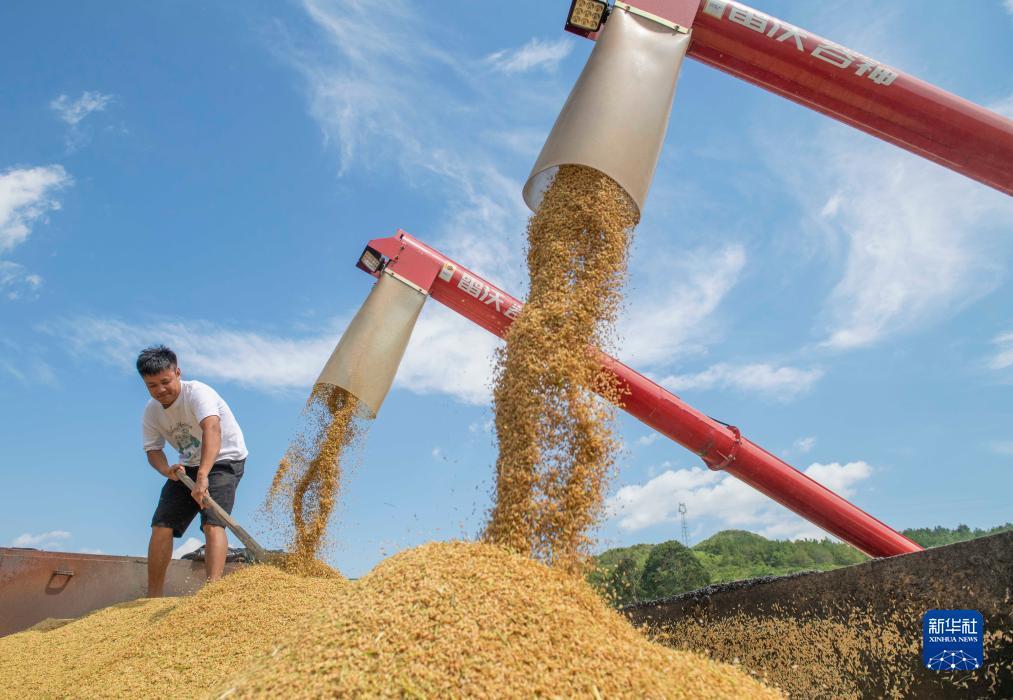7月10日,在湖南省永州市道县四马桥镇金狮庵村,农民把收割的早稻装车。新华社发(蒋克青 摄)