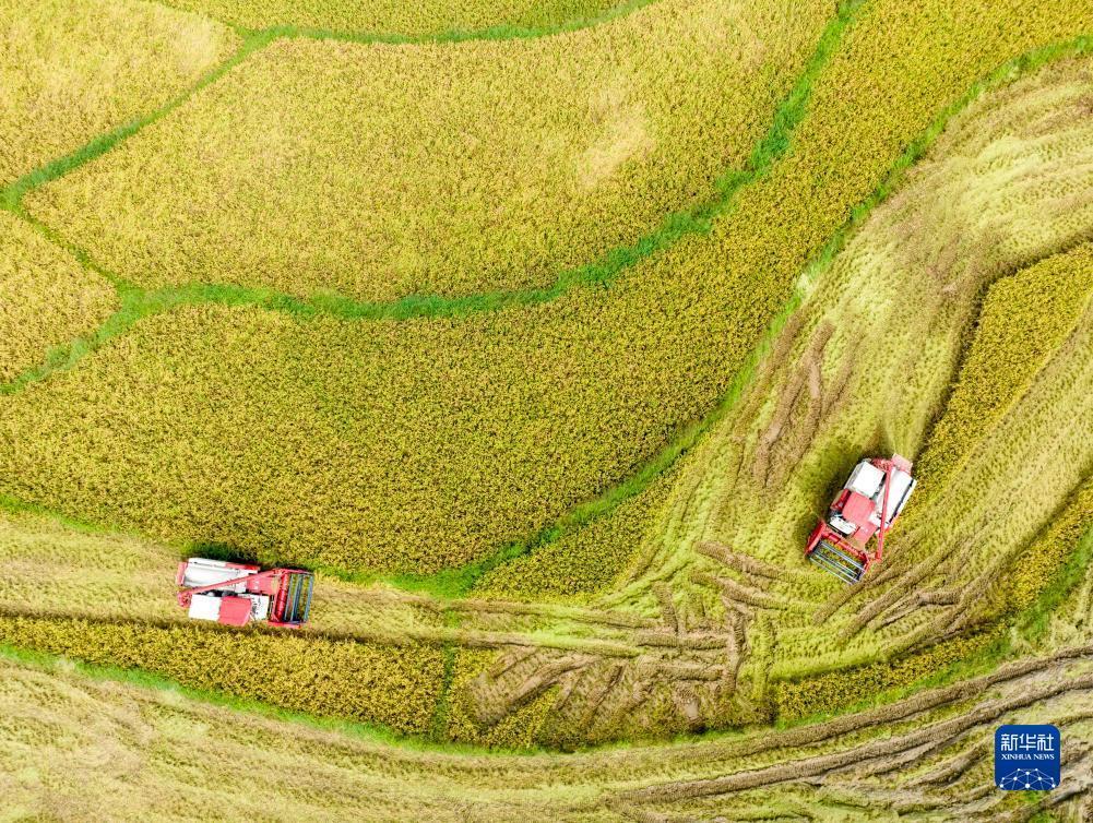 7月10日,在湖南省永州市道县四马桥镇金狮庵村,农民驾驶农机在田间收割早稻(无人机照片)。新华社发(蒋克青 摄)