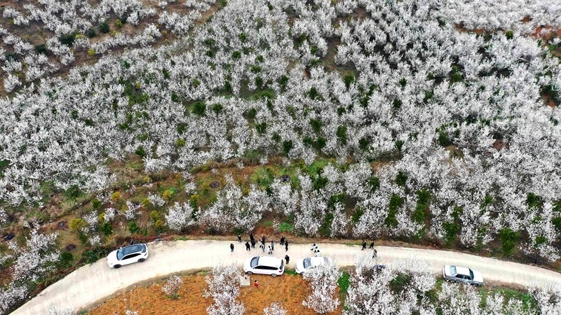 安龙县普坪镇香车河村的1100多亩玛瑙红樱桃也迎来盛花期,玛瑙红樱桃花竞相绽放,一簇簇、一团团缀满枝头,微风拂过,花瓣轻舞,与湛蓝天空相映成趣。漫山遍野的花海吸引了众多游客前来踏青赏花,烂漫的花景不仅醉了游人,也点亮了乡村的春日经济。