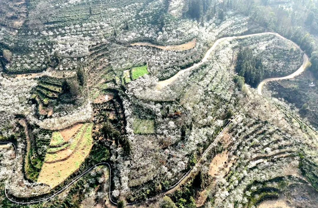 在贞丰,漫山遍野的李花次第绽放,千枝万蕊覆满枝头,层层叠叠、连片成海。远观如轻雪覆山,在青山绿野间铺展开一片清冷又温柔的诗意画卷。微风轻拂,花枝轻颤,淡淡暗香随风浮动,行走其间,远山静默,村落隐约,天地间只剩一片素白与宁静。