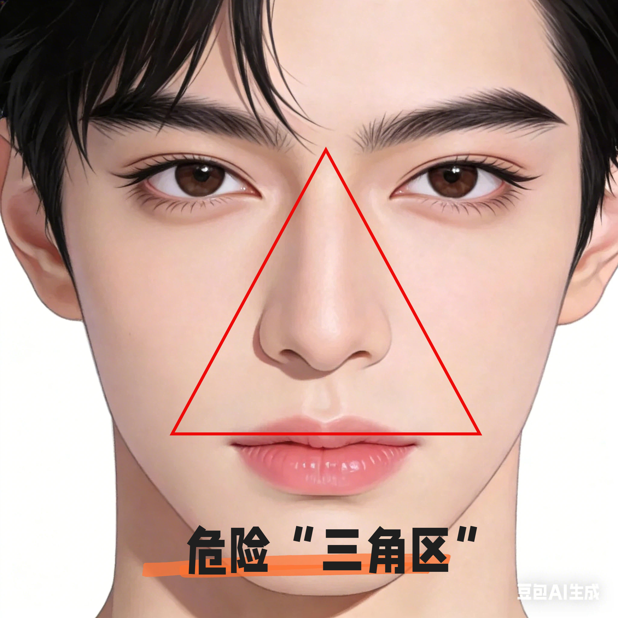 引发罕见但严重的风险:颜医生特别强调,如果痘痘位于面部“危险三角区”(即鼻根到两侧口角连线所形成的三角形区域),挤压可能导致细菌侵入血管,随血液回流至颅内,引发海绵窦血栓性静脉炎等颅内感染,虽罕见但后果极其严重。