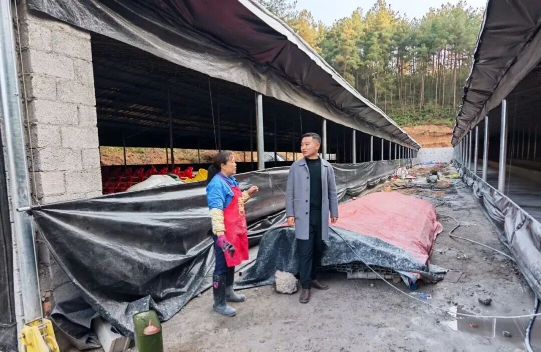 饶洁鑫至卡郎组吴斌户了解养鸭大棚建设情况