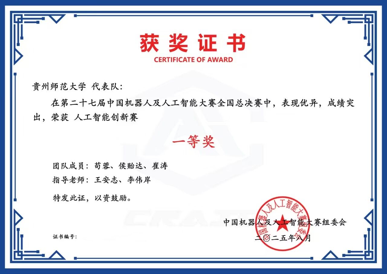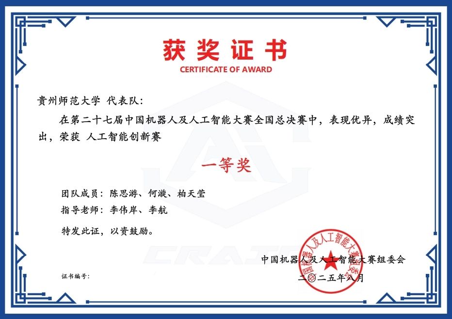 近日,第二十七届中国机器人及人工智能大赛全国总决赛在苏州、合肥和宜兴相继举行,中央电视台、新华社和人民网等三大央媒广泛报道该项竞赛。贵州师范大学参赛学子表现优异,共斩获国赛一等奖2项、二等奖4项、三等奖5项、优秀奖2项。其中,该校大数据与计算机科学学院本科生苟蓉、侯贻达、崔涛团队研发的作品《影像食韵阁》,陈思游、何漩、柏天莹团队研发的作品《智策股航-AI驱动股票预测》均在人工智能创新赛道上荣获国赛一等奖,这是该校在该赛事上“0”的突破。