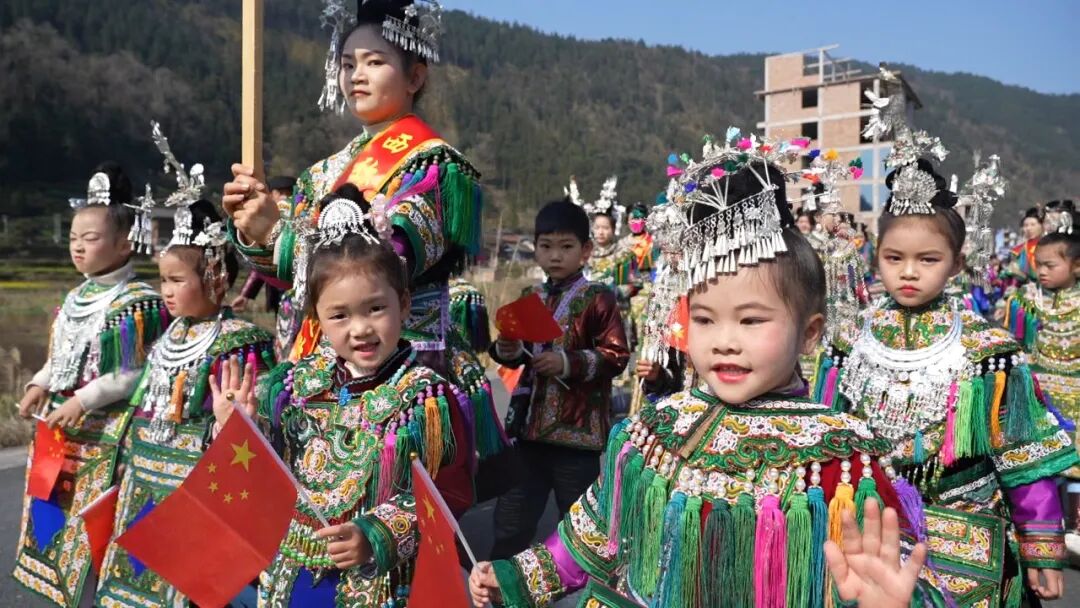 午后的盖宝侗寨暖意融融,13点30分,“村舞笙歌” 民族大联欢巡游从盖宝侗寨朱冠寨门出发,巡游队伍沿着沿河公路向盖宝足球场行进,巡游路线上,身着侗族盛装的村民、演员们载歌载舞,银饰叮当与欢声笑语交织。巡游队伍如同流动的风景线,拉开了全天活动的序幕。