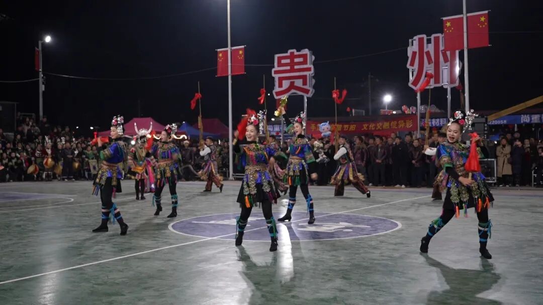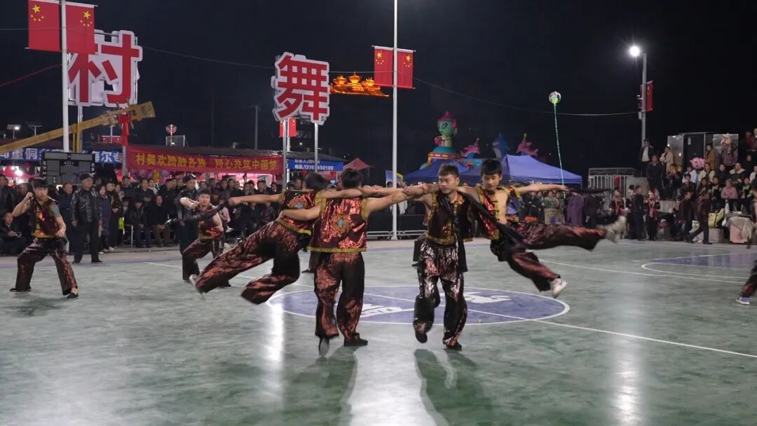 夜幕降临,篮球场上灯光璀璨,“村舞村歌” 文艺晚会如期而至。开场歌舞《村歌嘹亮》拉开了晚会序幕,黎平县艺术团的演员们用舞步勾勒出侗乡的秀美风光。《农耕舞》再现田间劳作的质朴场景,《天籁情歌》唱响甜蜜恋曲,侗族舞蹈《摔》刚劲有力,《我爱你中国》引发全场大合唱,巨幅五星红旗的徐徐展开,更是表达了侗乡儿女的爱国之情。精彩纷呈的文艺表演赢得现场观众阵阵掌声。最后由全体嘉宾、演员与观众共同参与的千人蹦迪,将晚会气氛推向高潮。