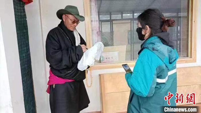 图为麦桃吉热情接待前来咨询的民众。(资料图) 中国邮政集团有限公司甘肃省玛曲县分公司供图