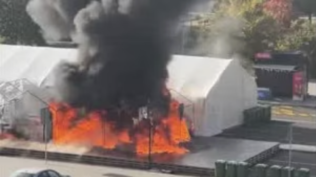 当地时间10月22日,在枪击事件发生后不久,塞尔维亚议会大厦外一个帐篷起火。图源:澳大利亚广播公司