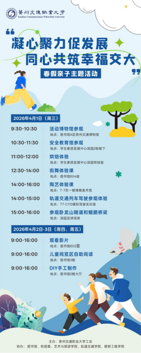 近日,记者从贵州交通职业大学获悉,4月1日至3日,该校将依托学校“十大重点工程”中的“幸福交大”工程,特别策划推出系列亲子主题活动,由学校老师全程陪伴,为教职工子女提供一个有趣、有料的春假去处。