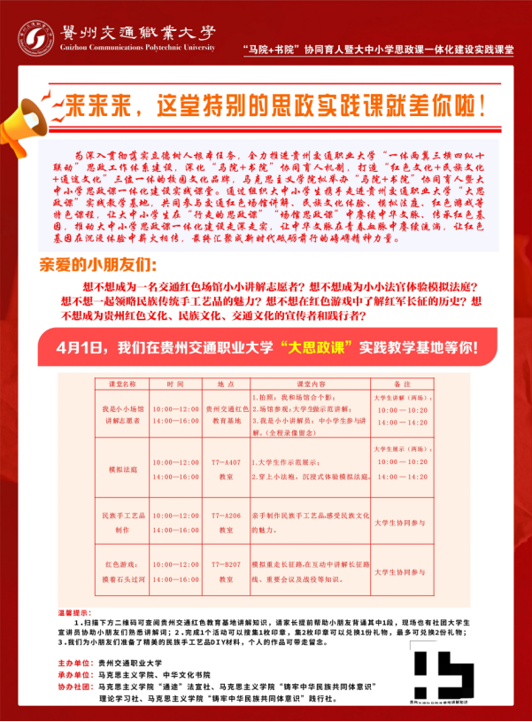 春假期间,贵州交通职业大学将举办“马院+书院”协同育人暨大中小学思政课一体化建设实践课堂,组织教职工孩子走进学校“大思政”实践教学基地,参与交通红色场馆讲解、民族文化体验、模拟法庭、红色游戏等特色课程,让小朋友们在“行走的思政课”与“场馆思政课”中赓续中华文脉、传承红色基因。