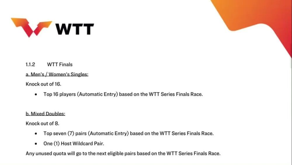 更新后的WTT手册还规定,总决赛积分榜计算方式变更为一名球员或一对组合在当年积分计算截止日期前所有大满贯赛事、冠军赛和挑战赛上所获积分之和。总决赛参赛资格获取条件包括:单打项目上,WTT冠军赛中,一名球员在相应的报名截止日期前符合参赛资格时最多只能退赛两次,因医疗原因获准退赛的球员不受此限制;混双项目上,一对组合至少要参加两站WTT系列赛。
