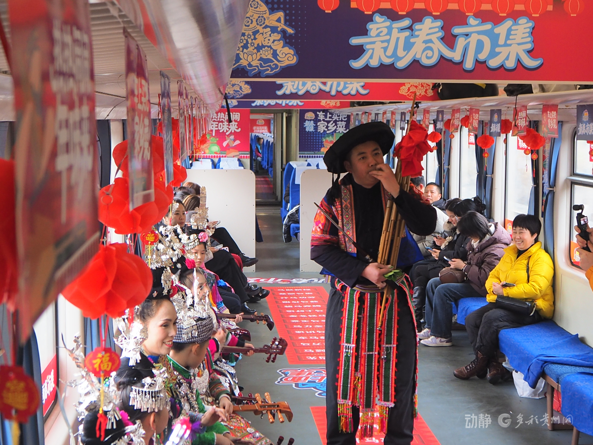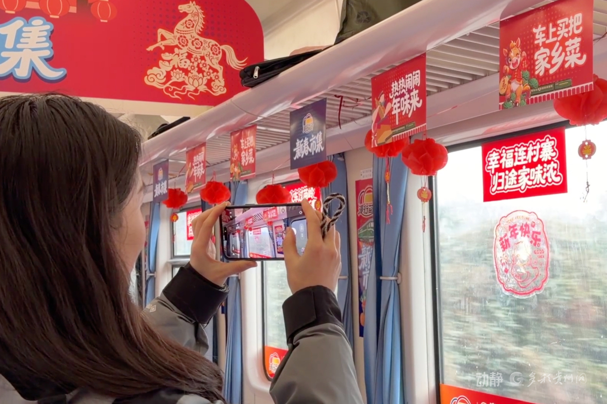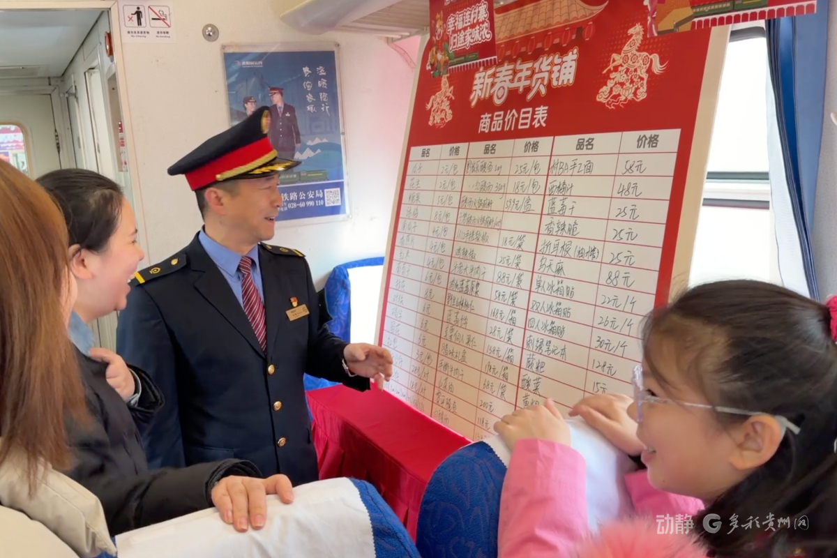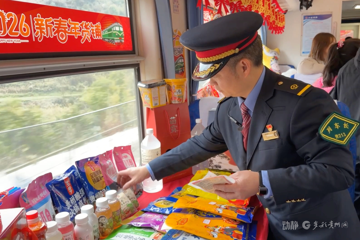 这趟列车常年穿行在贵州黔东南的侗乡苗岭。因其逢站必停,串起铁路沿途100多个民族村寨,成为沿线村民通往城市的“幸福慢车”。今年春运期间,凯里市文旅部门联合成都局集团有限公司贵阳客运段、凯里车务段等多家单位,在5640次列车上打造了“热闹中国年·寻味黔东南”主题车厢,一场与往年不同的“新春年货铺”在这里开张。