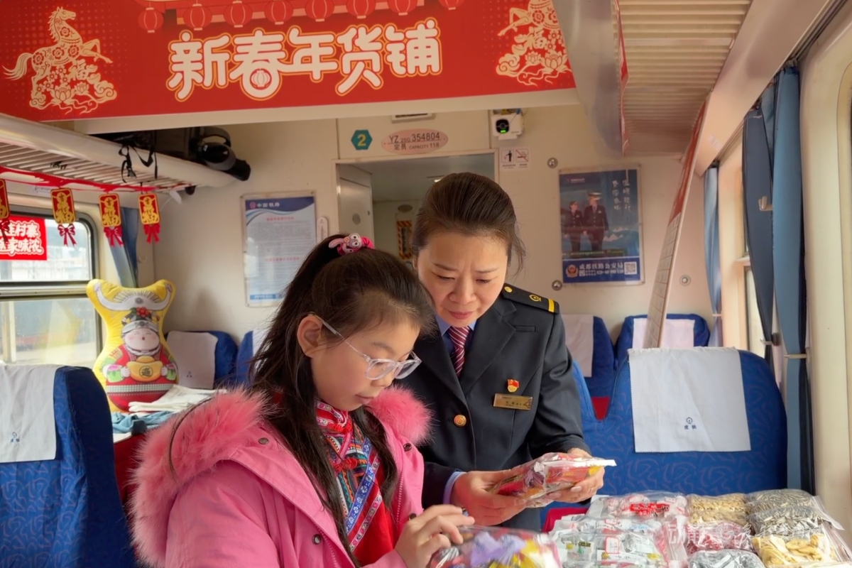 除了帮衬村民们增加收入,列车还想方设法丰富旅客的乘车体验。今年春运,5640次列车在继续开设的“乡村集市”和“新春年货铺”的基础上,还新增了非遗工坊、邮政主题、村火车大舞台等车厢,为老乡们带来更多文娱活动。