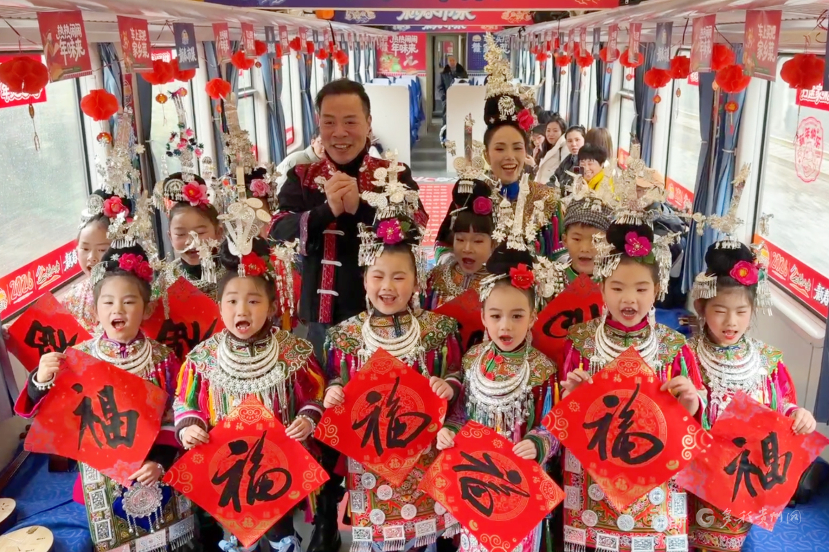在“非遗工坊”车厢,贵州省非物质文化遗产代表性传承人吴秀英在现场演示苗绣制作,吸引着旅客驻足观看。凯里市书法协会副主席姜通永挥毫泼墨,写下对联为旅客送上新春祝福。黔东南州歌舞团的演员们载歌载舞,原汁原味的民族风情引得老乡们阵阵掌声,引得车厢里笑声不断。铁路与邮政部门的工作人员协助寄递年货,送上明信片,让旅客们空手而来,满载而归。对于许多沿线村民来说,把山里的特产寄给城里的亲戚,或者把城里的新衣服带回家,这节车厢就是连接城乡情感的纽带。