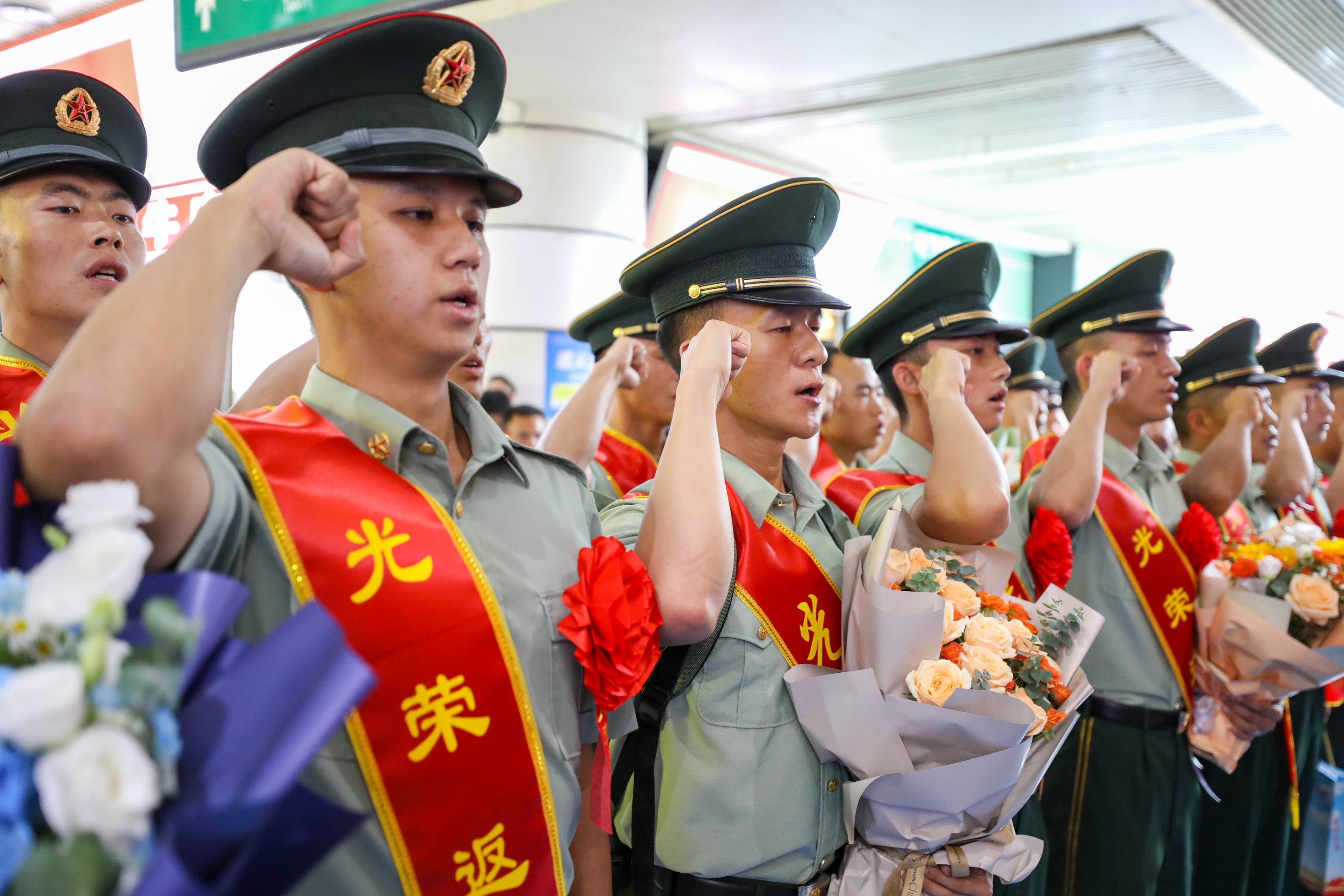 “我宣誓:服从中国共产党的领导,忠于祖国,忠于人民,保守军事秘密,珍惜军人荣誉,永葆军人本色......”在欢迎仪式上,退役军人右手握拳,庄严宣誓,誓言声声,铿锵有力,展现了退役军人“退役不褪色”的坚定信念。