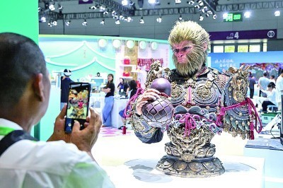 观众在第二十一届文博会上拍摄黑神话悟空半身像。新华社记者 梁旭摄