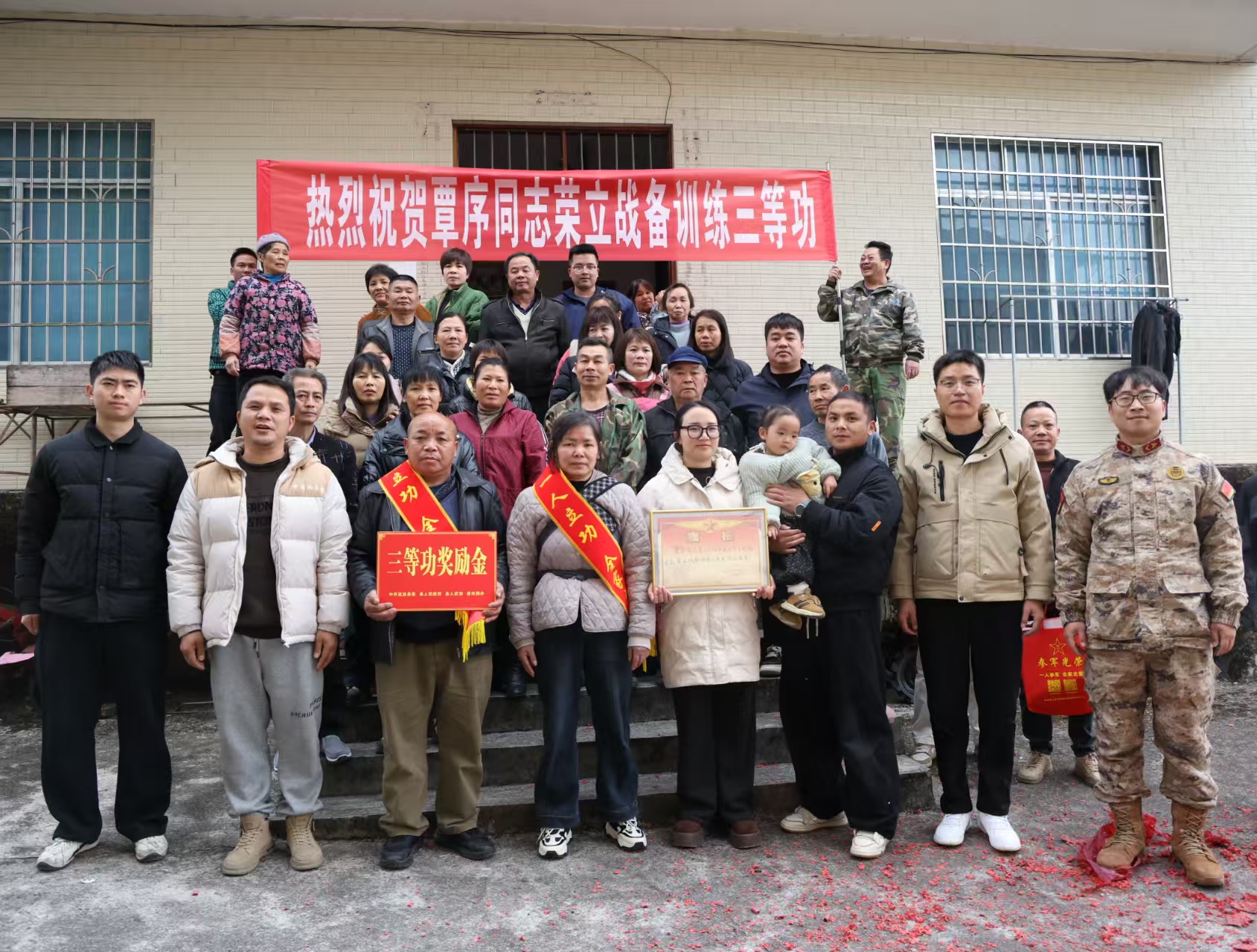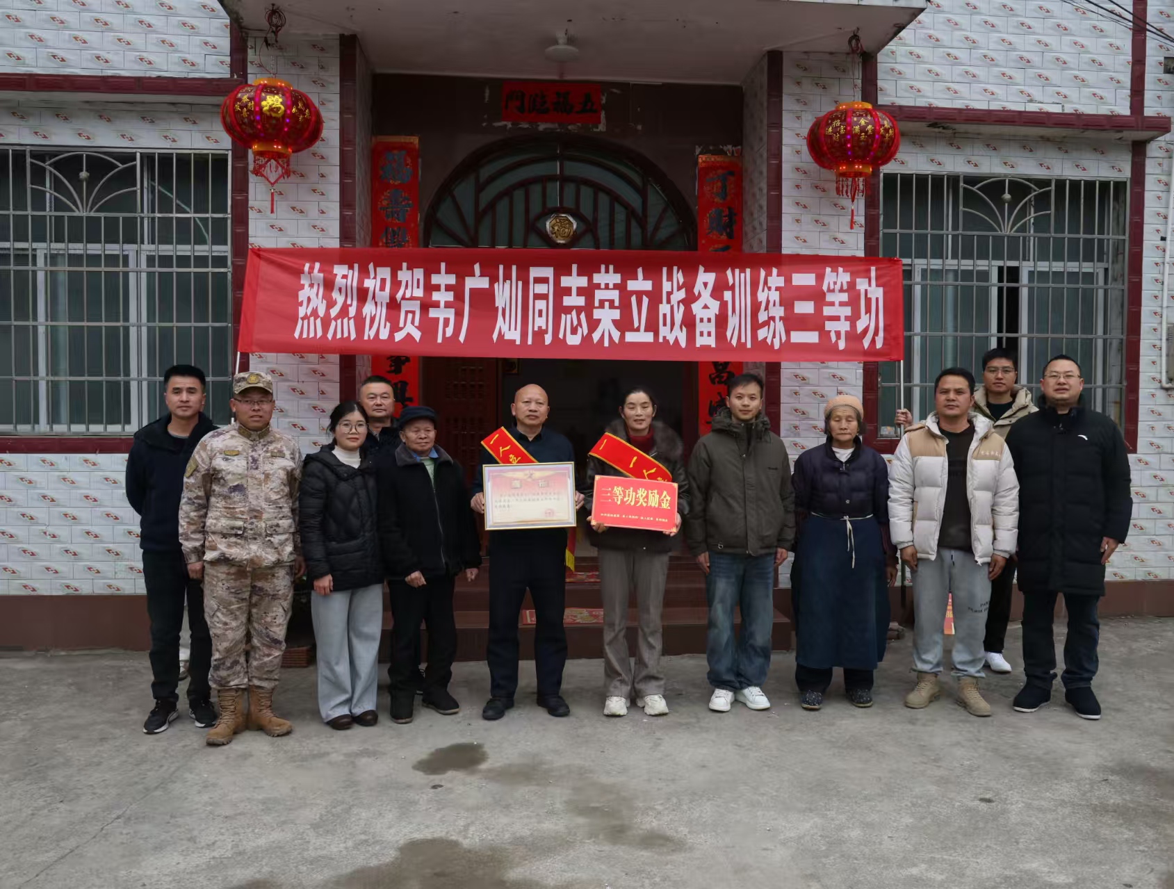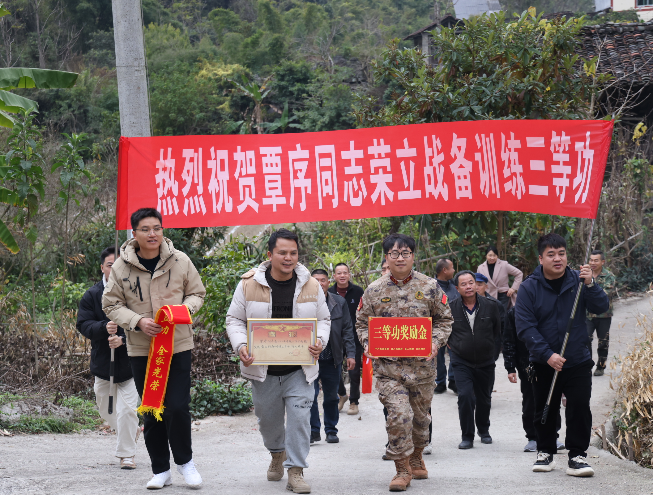 在欢快的锣鼓声和乡亲们热烈的掌声中,报喜团一行手捧立功喜报和慰问金,先后走进荣立三等功的现役军人覃海毅、韦利绕、韦广灿、覃序等多名同志的家中。慰问组郑重地将喜报交到军属手中,并为他们披上“一人立功,全家光荣”的鲜红绶带,赠上奖励金。军属们接过这份沉甸甸的荣誉,脸上洋溢着自豪与喜悦的笑容。