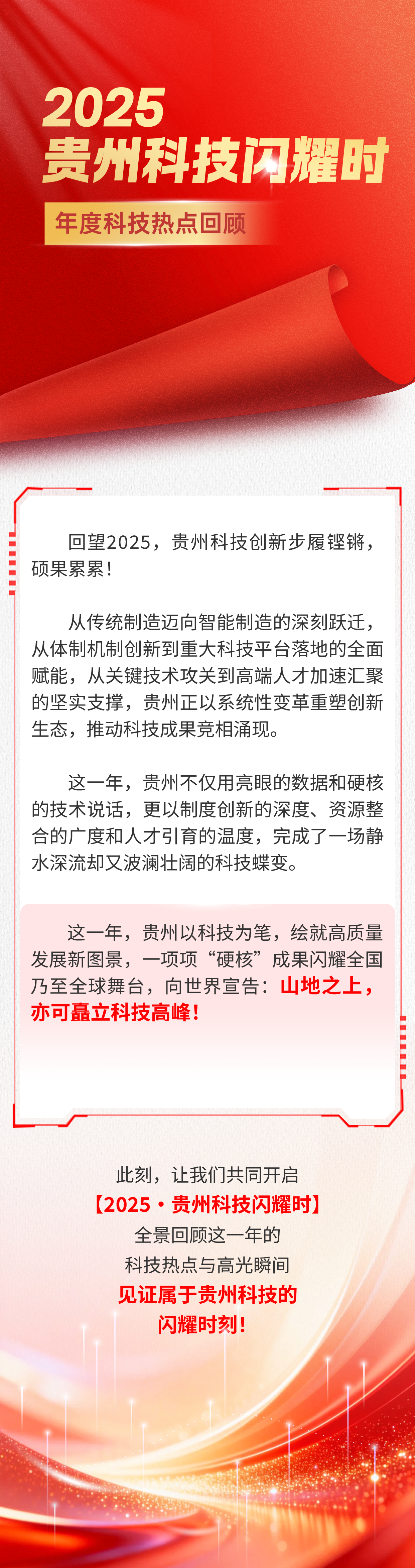 回望2025,贵州科技创新步履铿锵,硕果累累,一项项“硬核”成果闪耀全国乃至全球舞台。 此刻,让我们共同开启【2025·贵州科技闪耀时】,一起回顾这一年的科技热点与高光瞬间,见证属于贵州科技的闪耀时刻!