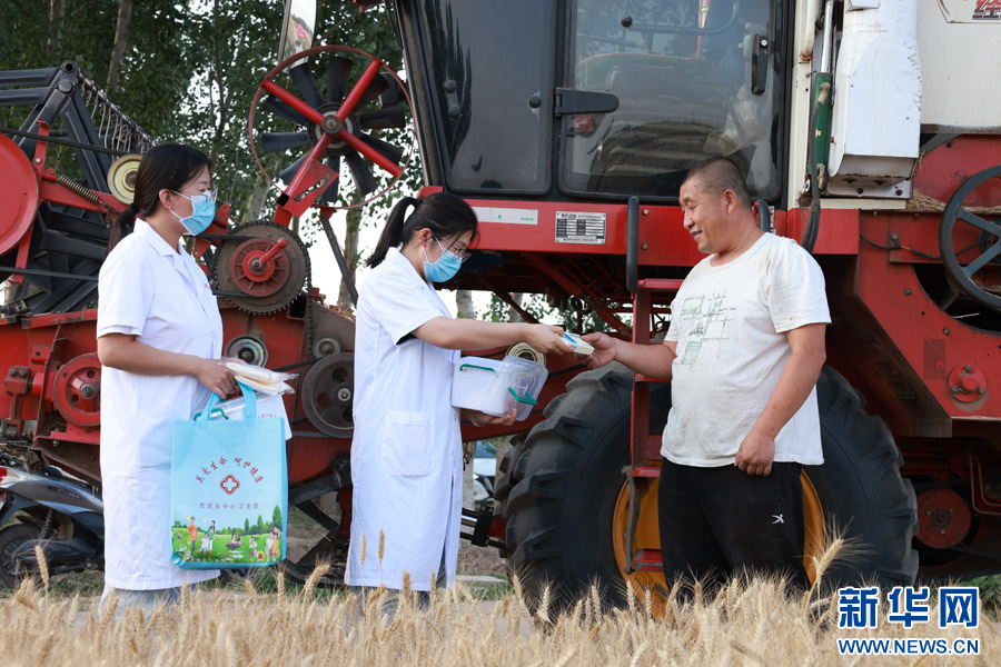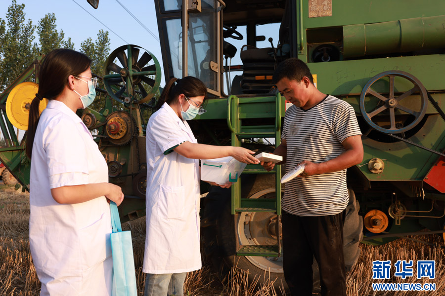 新河县西流乡卫生院的志愿者在田间地头发放防暑药品。新华网发 李世强摄