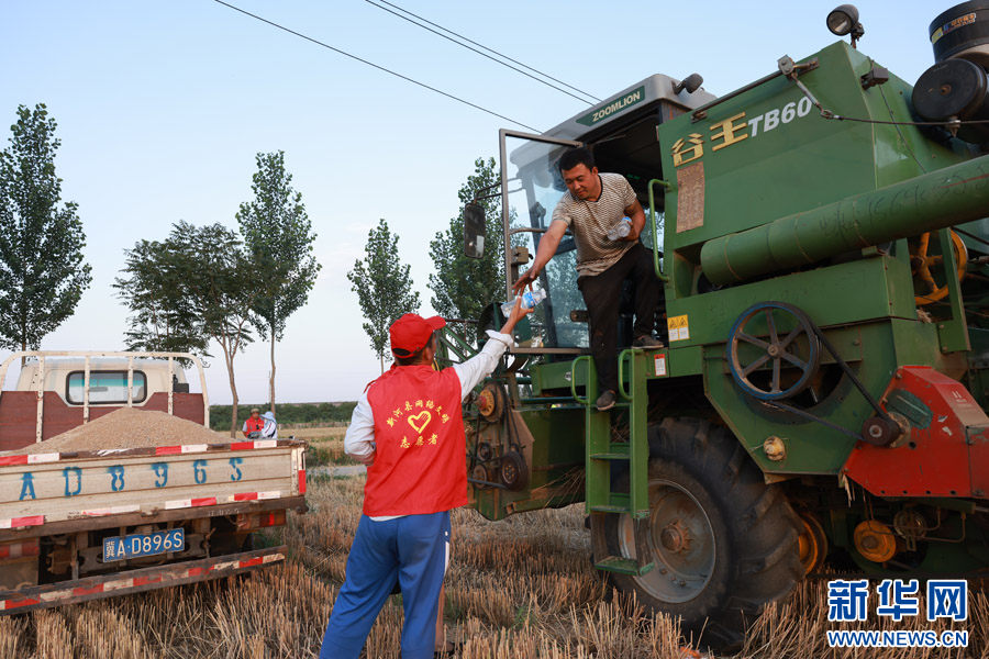 志愿者为收割机手送去防暑药品和毛巾。新华网发 林汇东摄