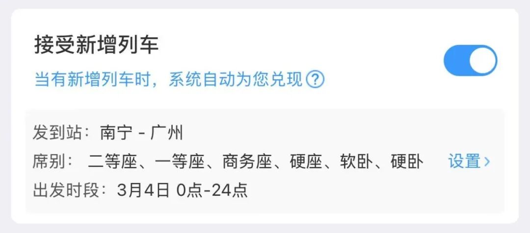 例:小王原计划于3月1日从南宁前往广州,理想车次车票已售罄,于是他添加了当日6趟列车候补购票,并勾选所有席位和出行时段,将选择范围扩至最大,同时勾选“接受新增列车”选项,将截止兑现时间设为“开车前6小时”。最后,在开车前10小时左右车票成功兑现。