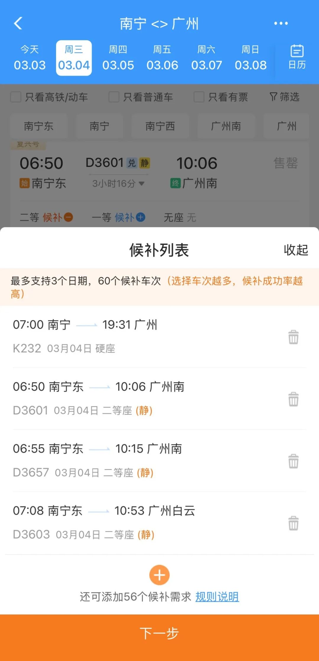 善用候补“捡漏”:候补是最优策略,同时也可在发车前几天关注是否有退票释放。