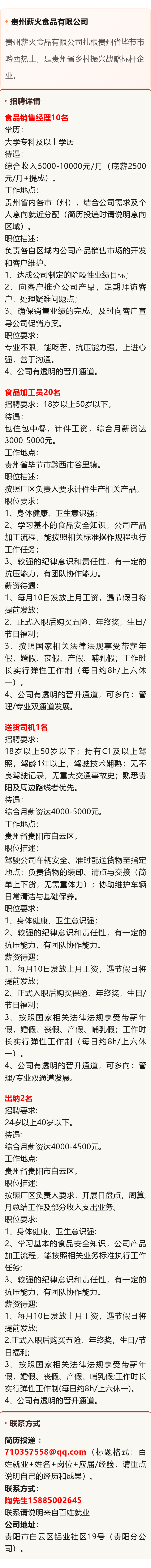 贵州薪火食品有限公司招聘食品加工员、送货司机等岗位!月薪可达10000元!