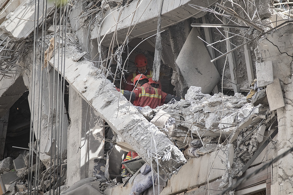 当地时间3月27日,消防员在伊朗德黑兰一栋被毁居民楼的废墟中工作
