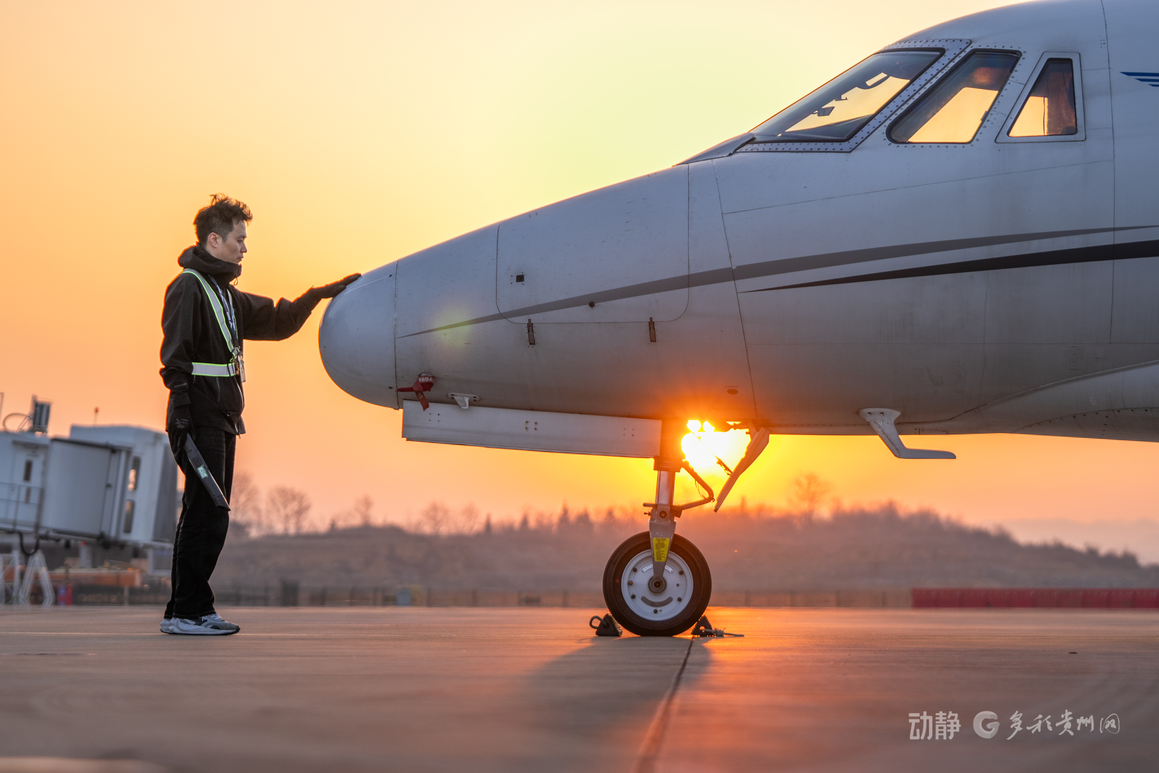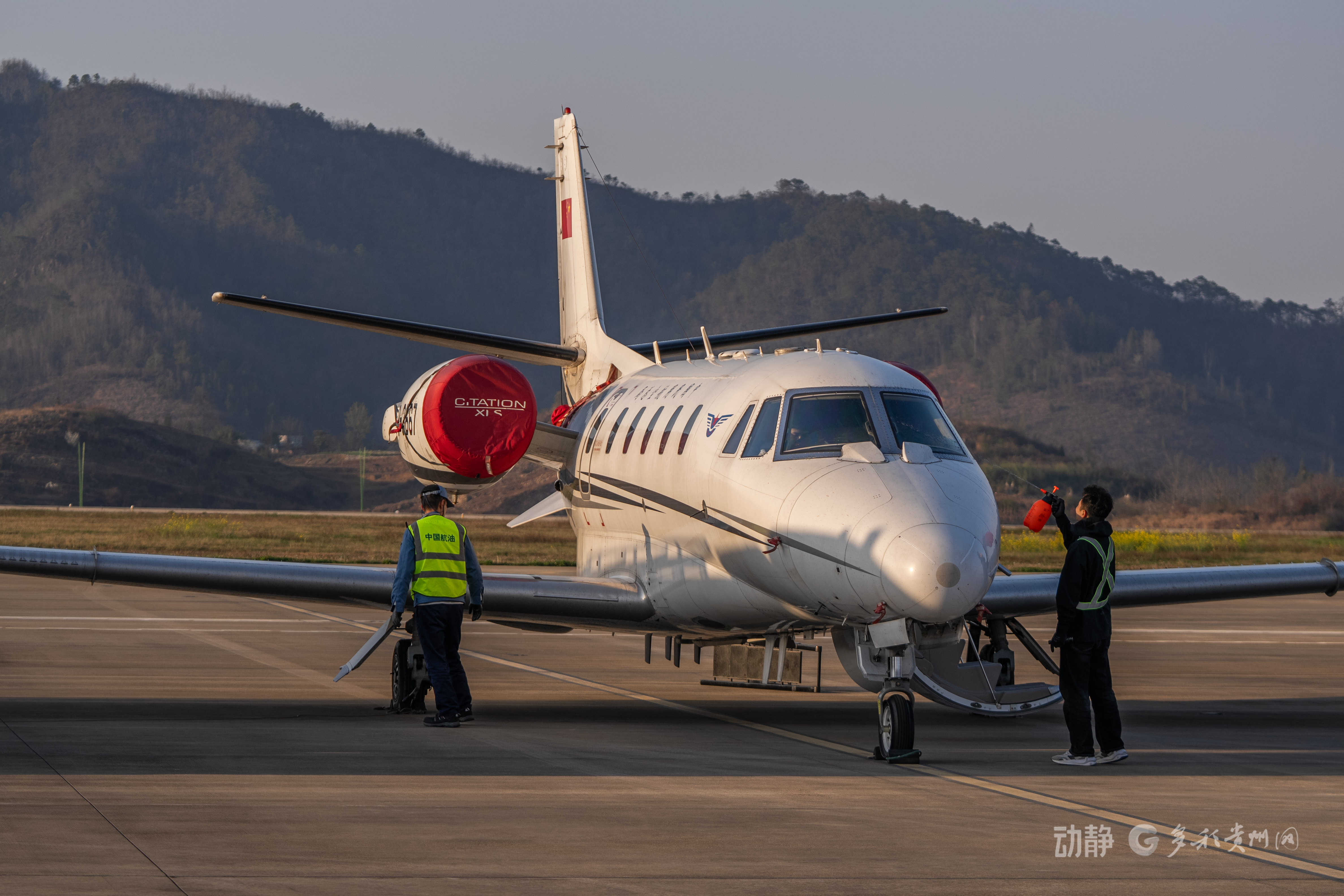 在毕节市飞雄机场,工作人员正在对校飞飞机进行检查